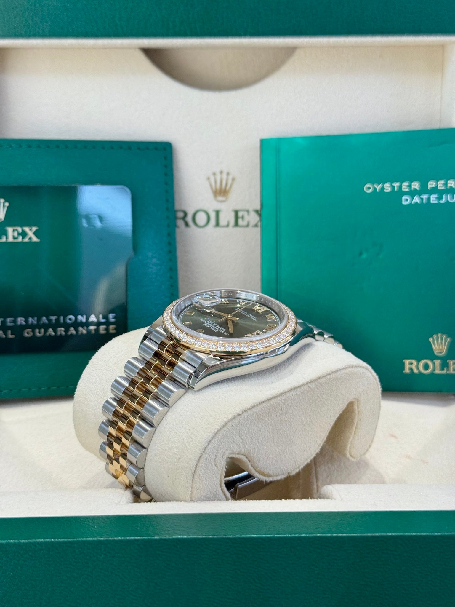 Dial: Olive dial with diamond pave VI and IX hour markers. Date calendar at 3 o’clock aperture.