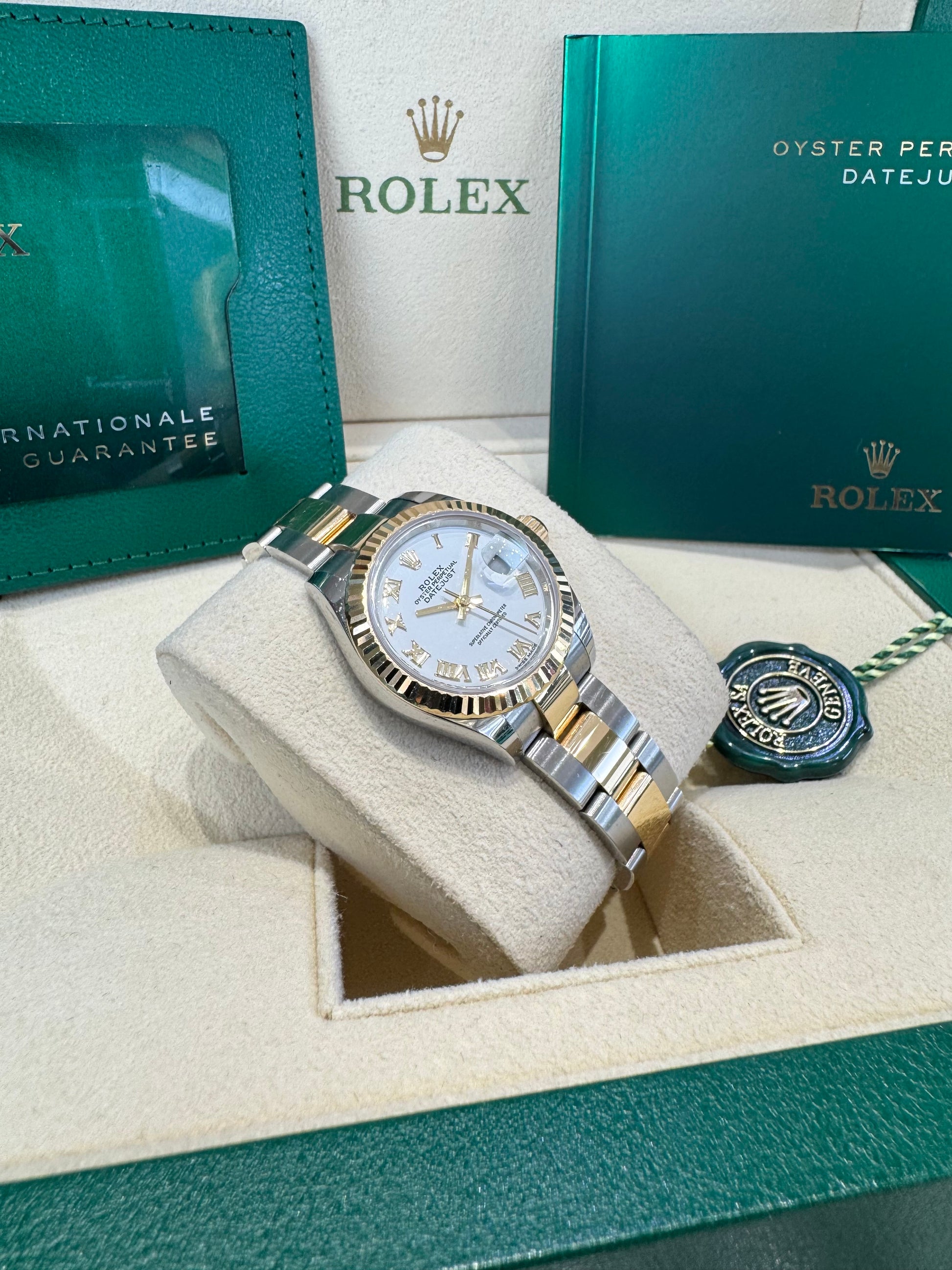 Dial: White dial with Roman numerals. Date calendar at 3 o’clock aperture.