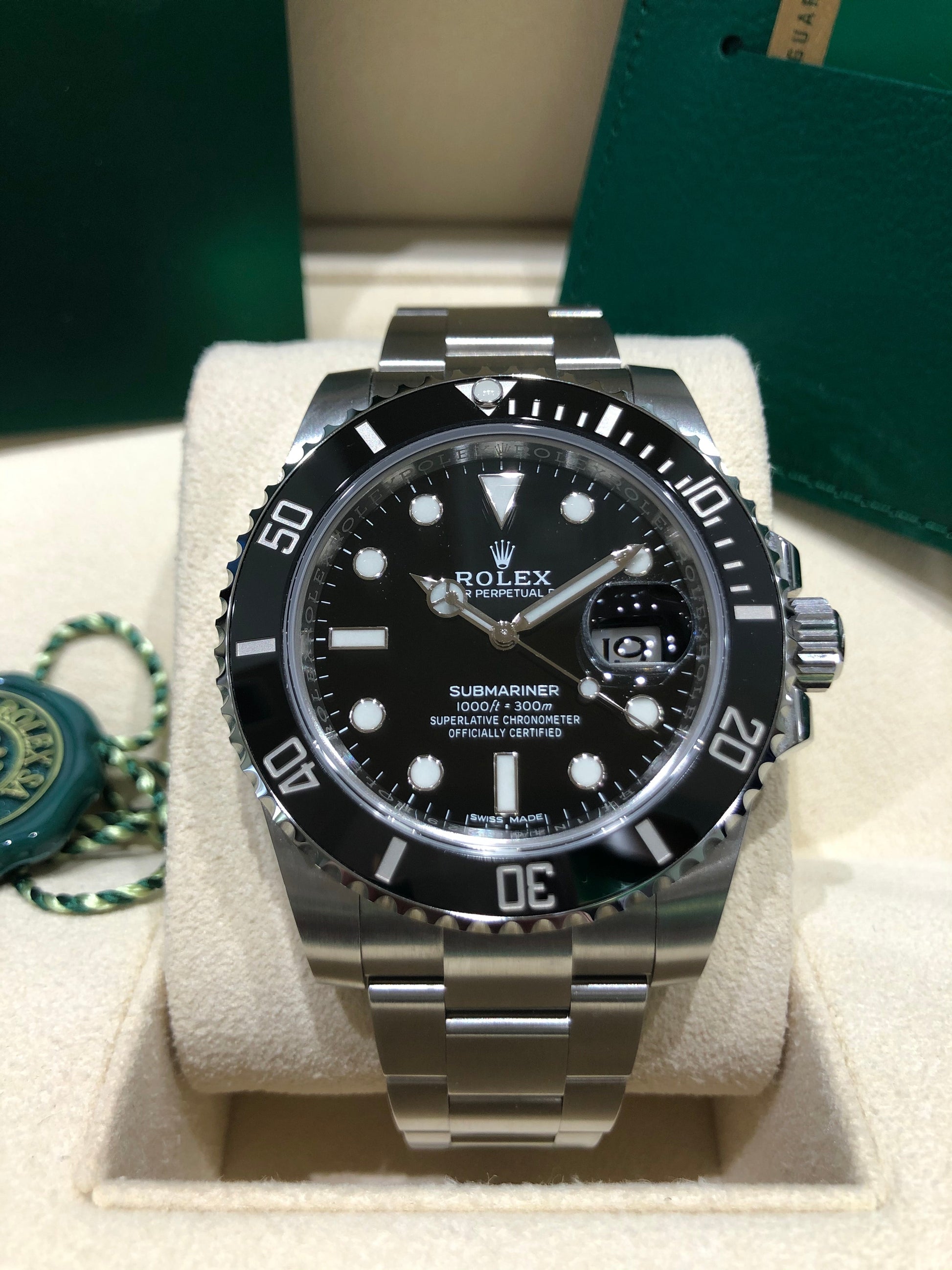 Bezel: Unidirectional black ceramic bezel with 60 minute graduation. Inner engraved Rolex bezel ring